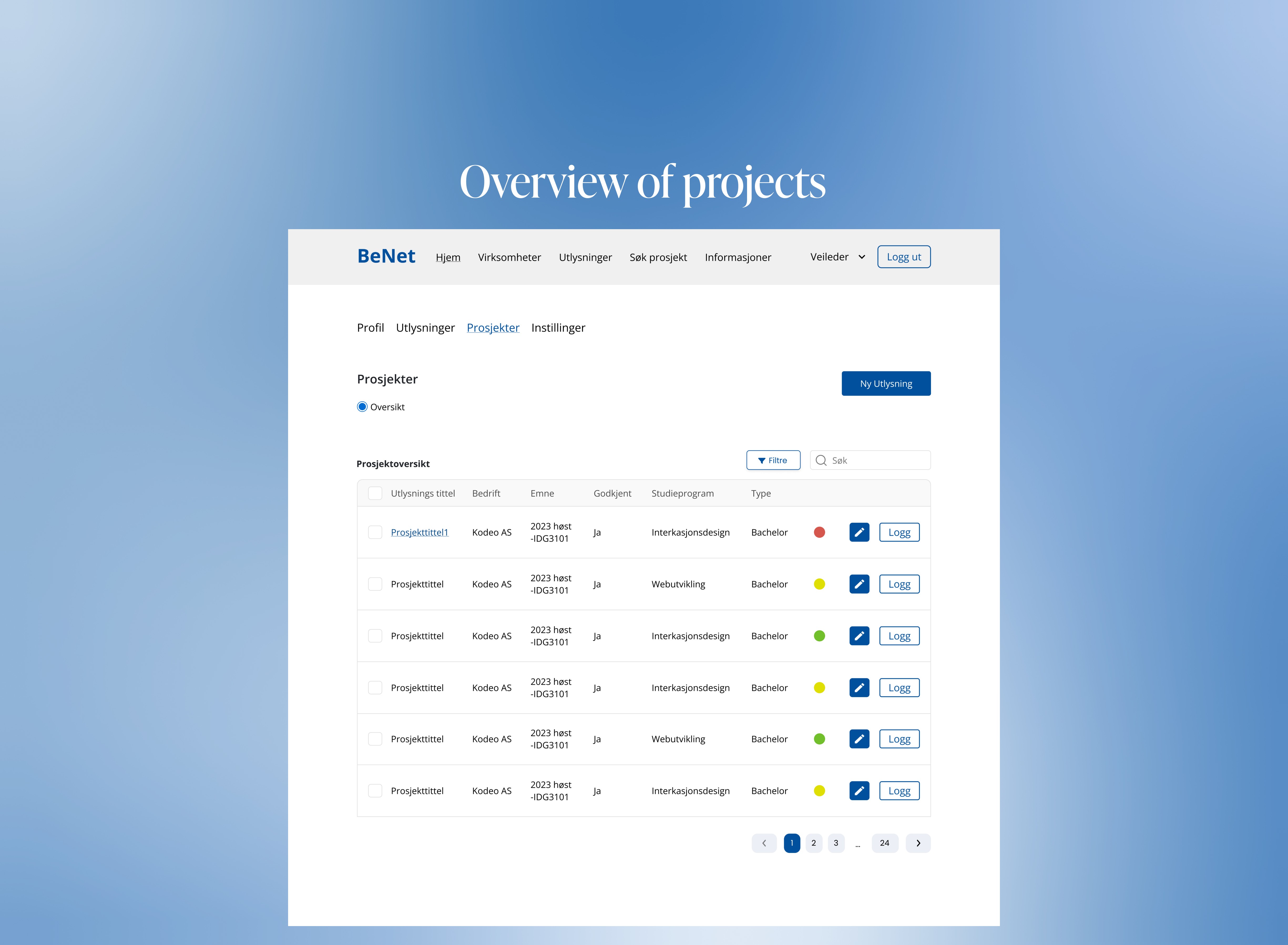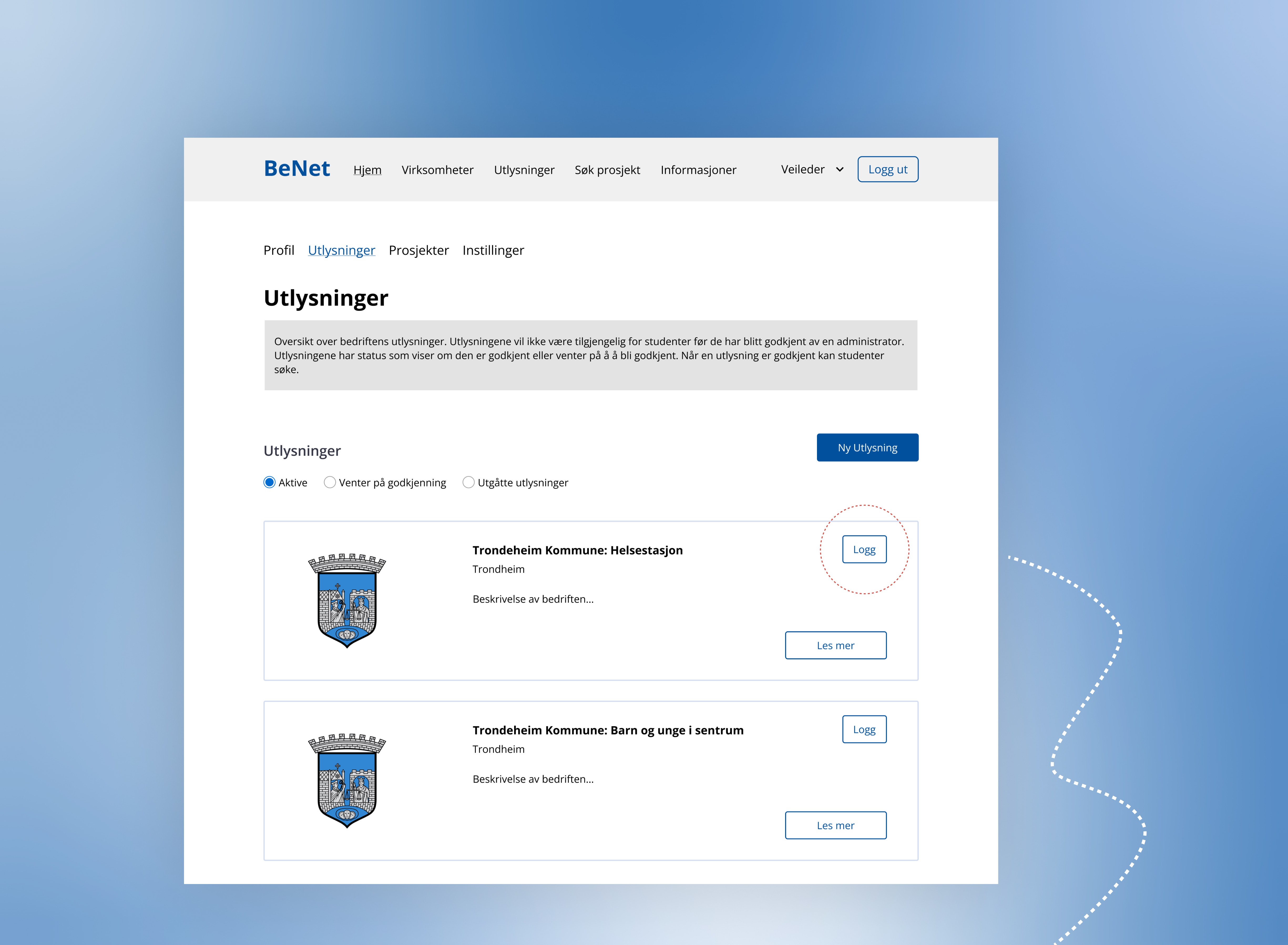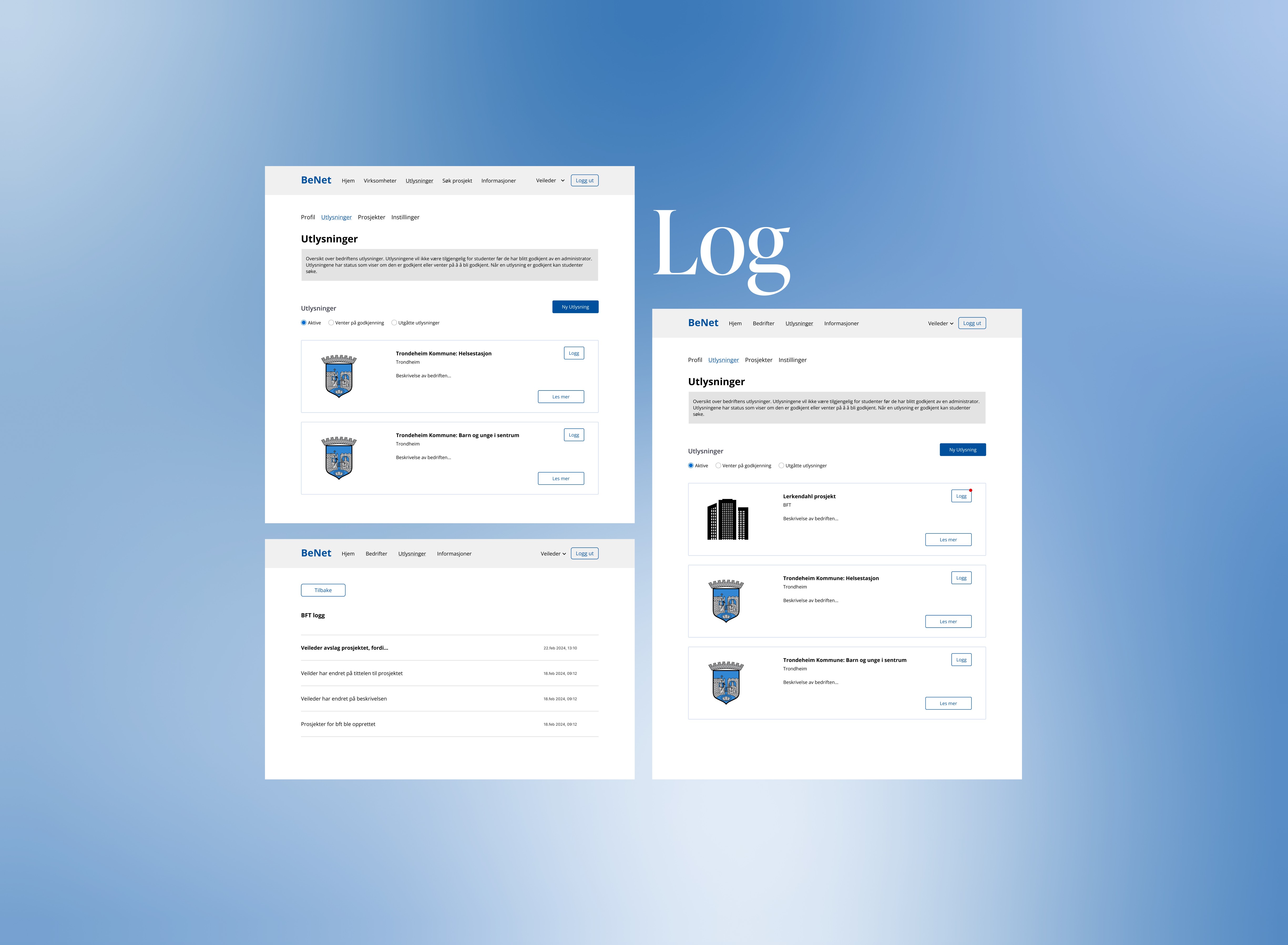 BeNet is a platform created by NTNU to help interaction design and web development students prepare for their careers. It streamlines the organization of 3rd-year student internships, reducing repetitive administrative tasks by allowing students and companies to register, manage contacts, and track potential matches in one place.