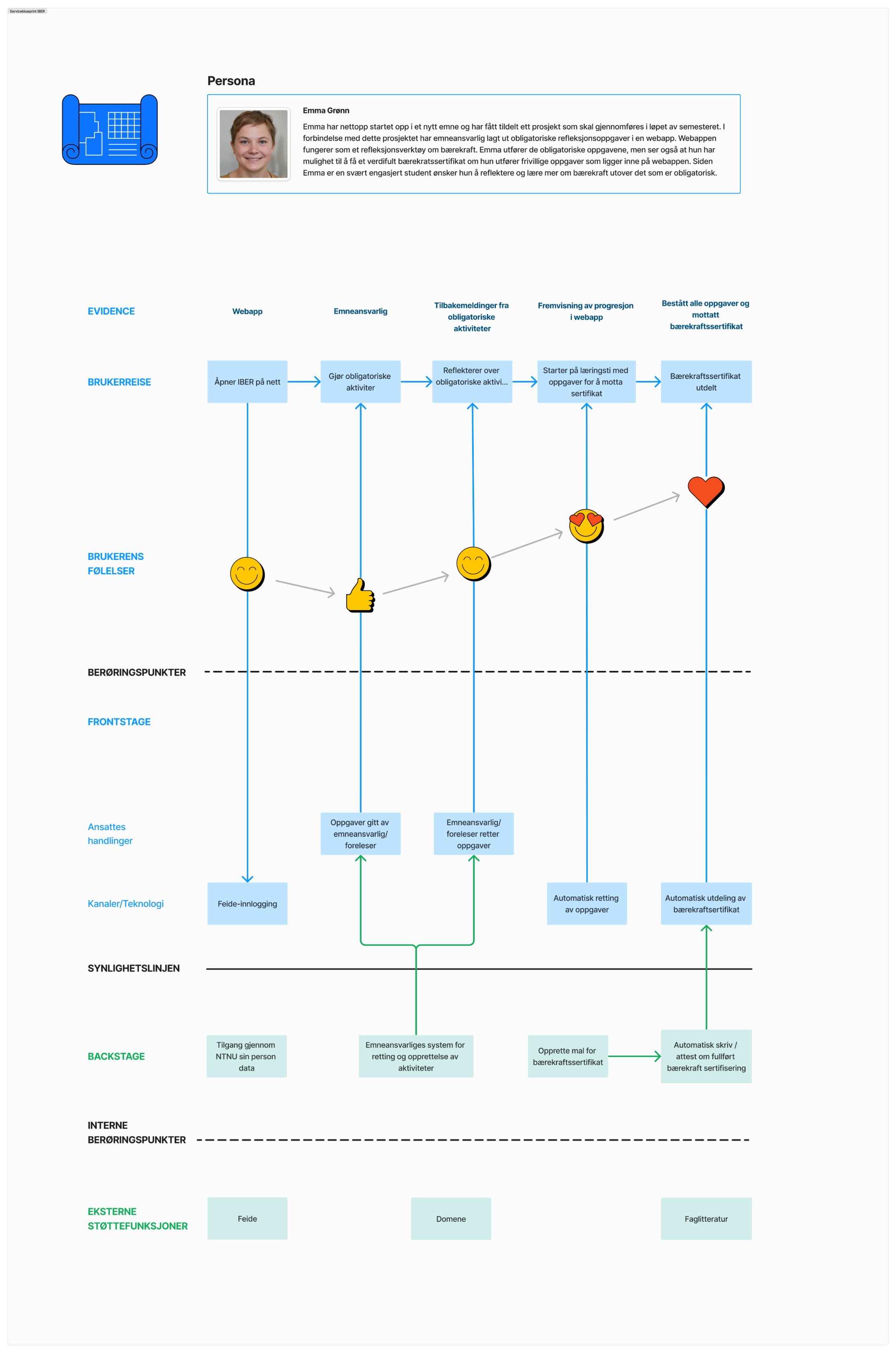 The service maps offered a visual overview of the visible and invisible components and touchpoints within the service. Combined with personas and user journeys, we gained a detailed understanding. The visible components, or frontstage, include elements the user sees and interacts with. The map below illustrates a user journey alongside the user's emotions and relevant touchpoints.